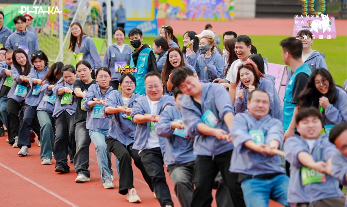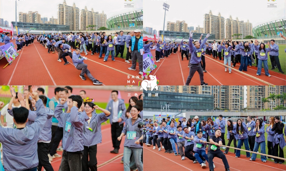 【项目PK·趣味拔河】12支队伍抽签组成6个联盟队,每队20人(10男10女)同台竞技,晋级赛两两PK,终极赛三向对决,绳结两端凝聚团队力量,呐喊声震彻全场!