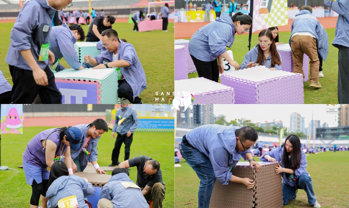 【项目PK·能工巧匠】全员上阵挑战!团队协作将8块带企业文化标语的充气方块,从片状组合成立方体再层层垒起,坚持5秒不倒即为成功,凝聚智慧与合力~