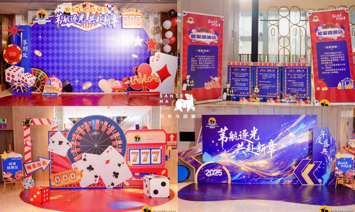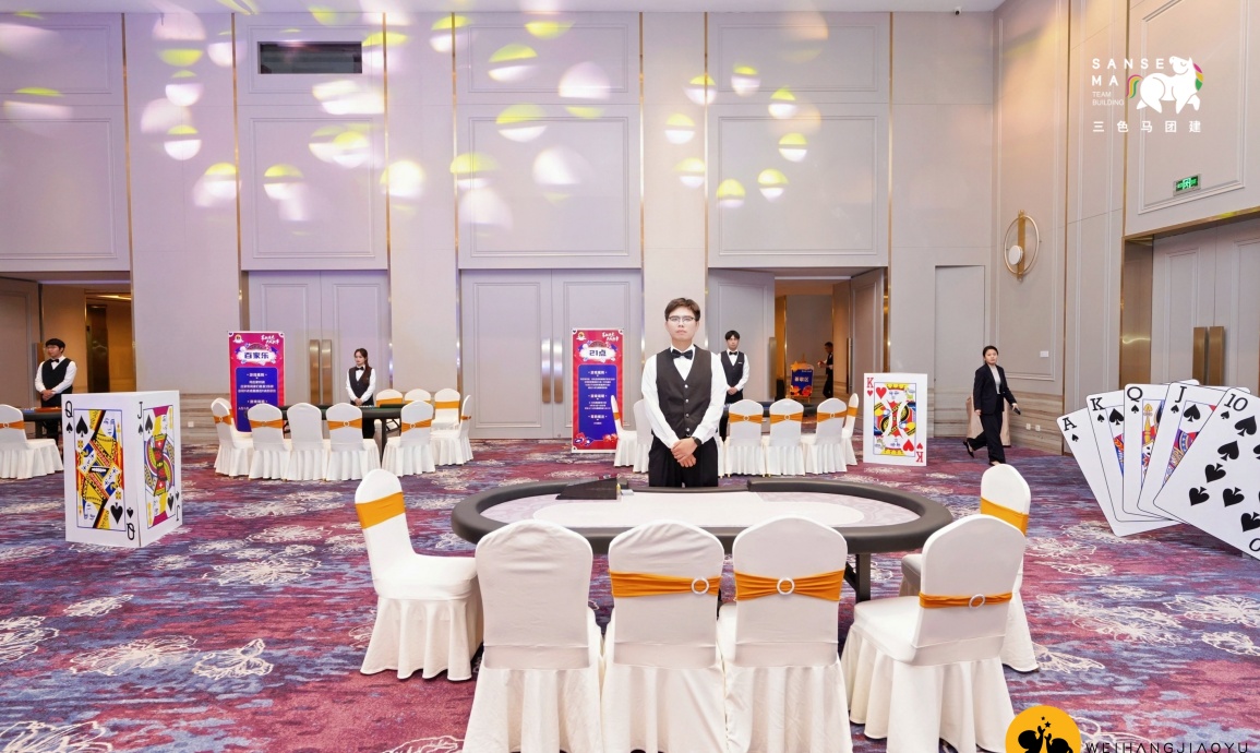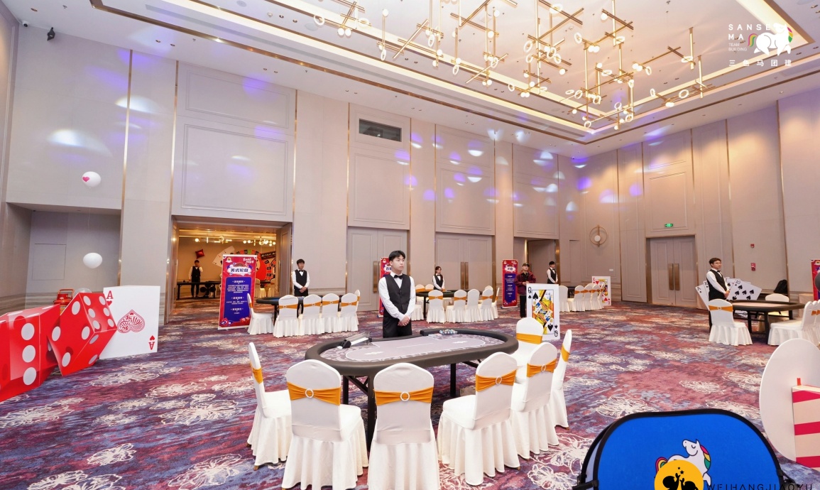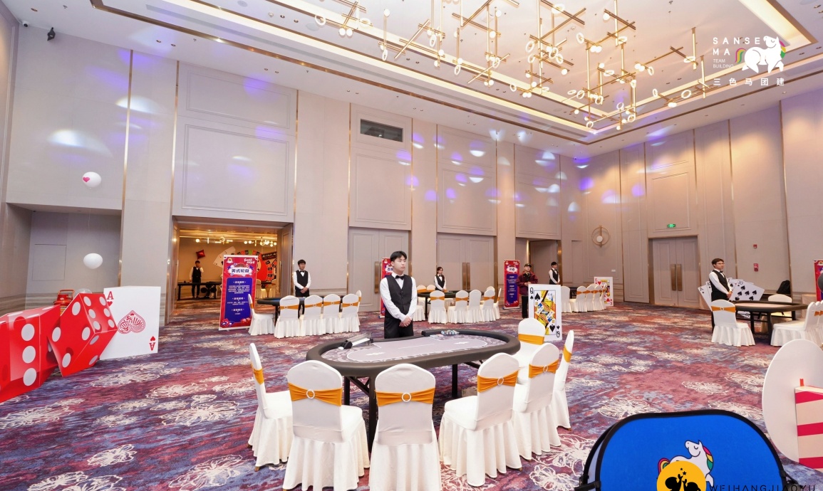 【活动布场】三色马团队提前精心布置,将皇冠酒店宴会厅打造成沉浸式拉斯维加斯赛场,赌场竞技区、能量补给区、互动体验区、晚宴区层层递进,灯光与装饰尽显奢华氛围,静待180名伙伴赴约~