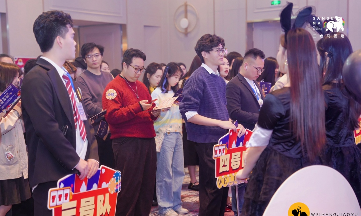 【筹码创意签到】伙伴们陆续到场,以独特的筹码签到开启年会之旅,队长领取专属物资(队伍手举牌、标识、游园卡、总筹码),仪式感拉满,满是对这场狂欢的期待~
