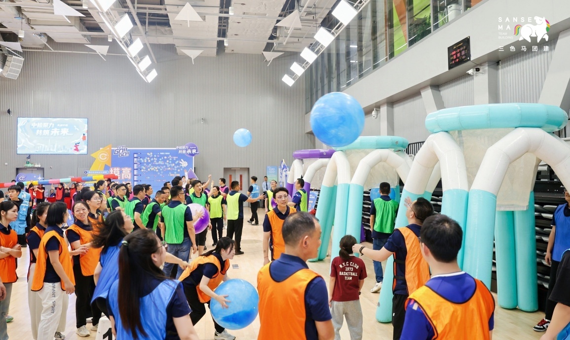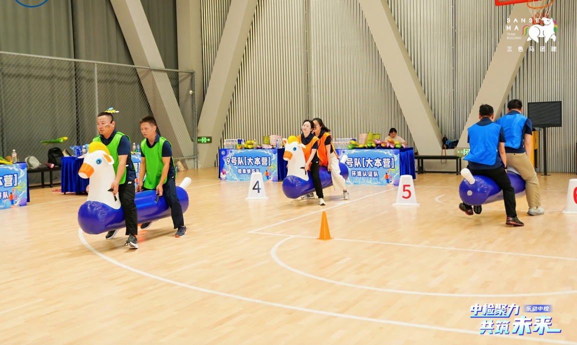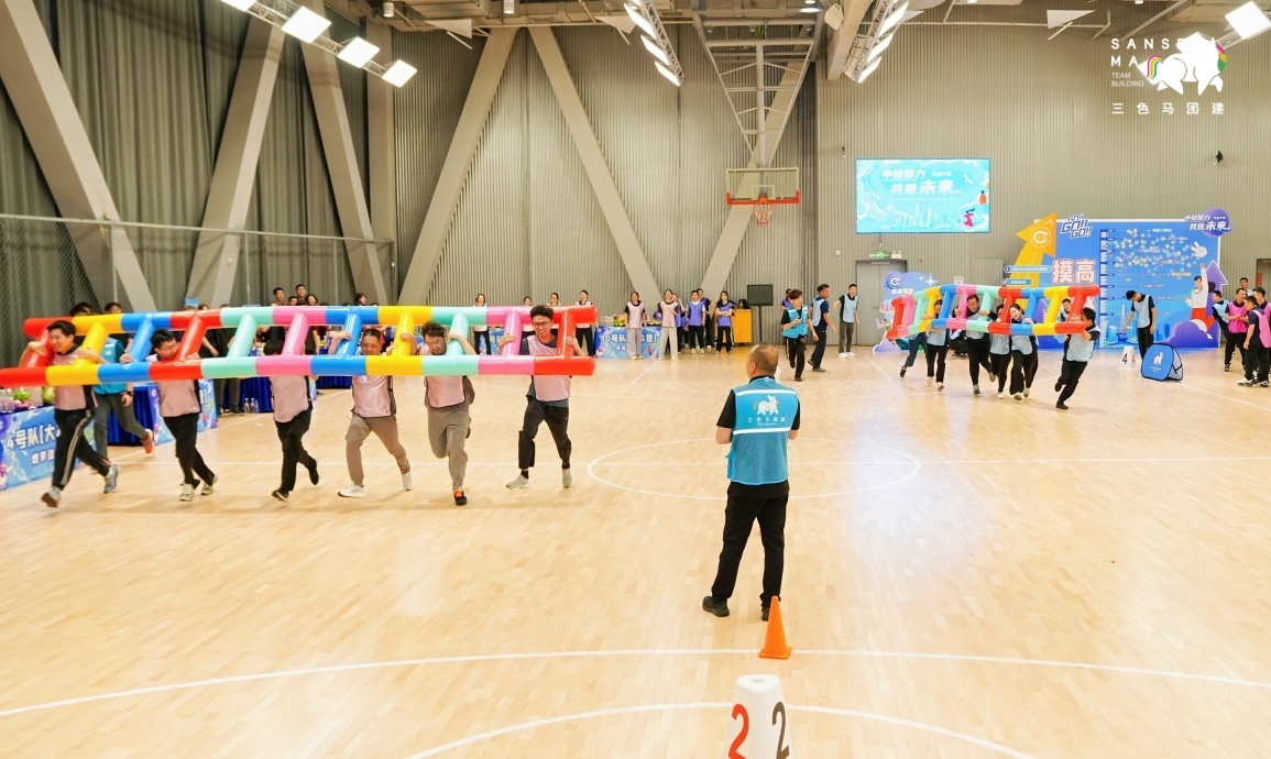 【趣味比赛环节】工作人员布置赛道、助教引导队伍轮换,依次开展招财进宝、超级NBA等项目比拼。最后进行同心击鼓挑战,10支队伍组成联盟队竞技,按名次为各队加分,现场氛围热烈。