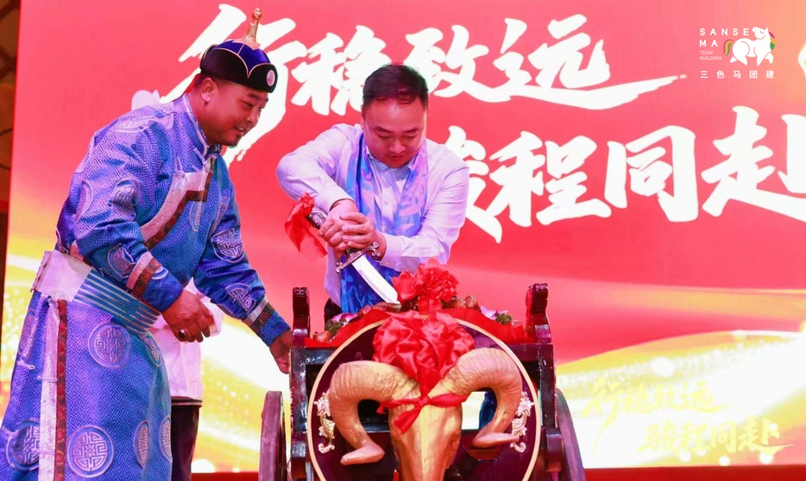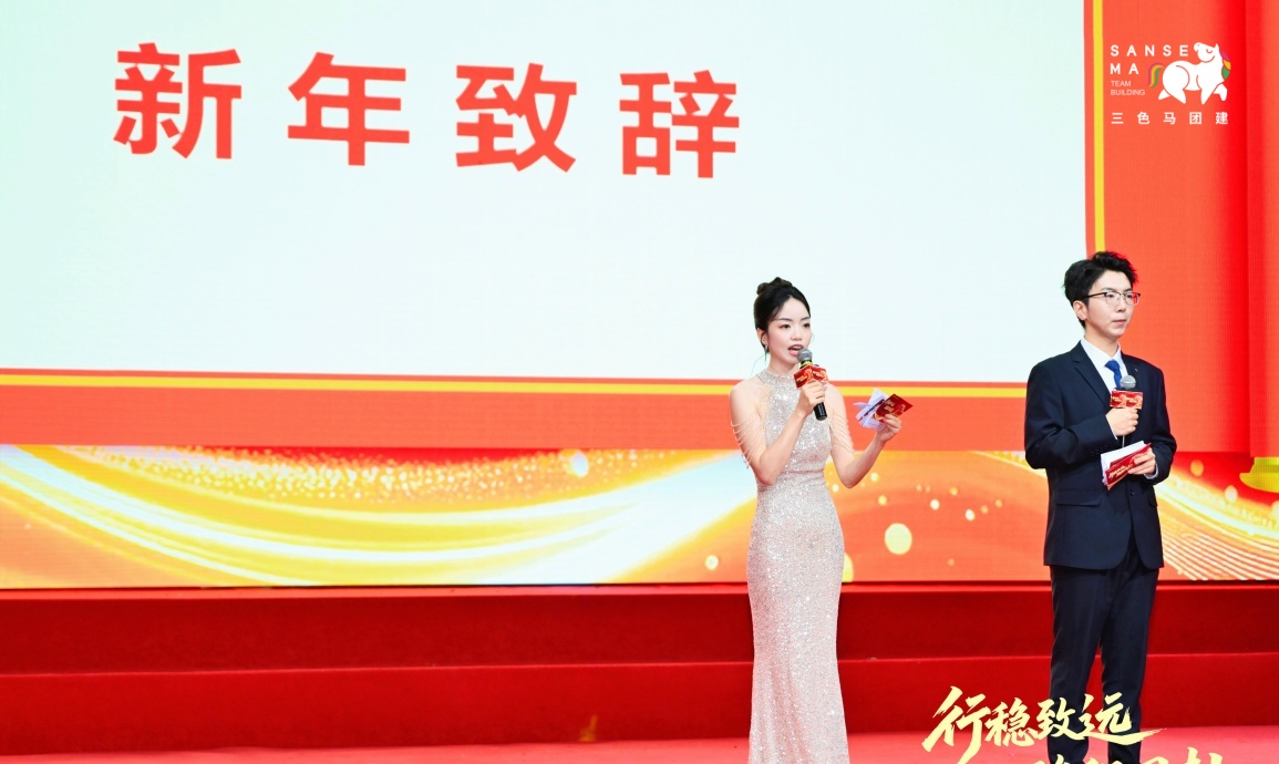 【晚会晚宴】暖场视频、开场倒计时视频播放后,主持人登场,王总发表讲话,随后进行颁奖、誓师大会授旗,穿插精彩节目、抽奖及综艺互动,跑马舞蹈、开羊仪式依次上演,全员举杯合照。