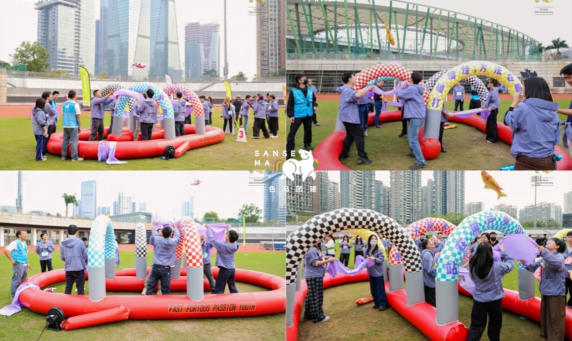 【项目PK·能工巧匠】全员上阵挑战!团队协作将8块带企业文化标语的充气方块,从片状组合成立方体再层层垒起,坚持5秒不倒即为成功,凝聚智慧与合力~