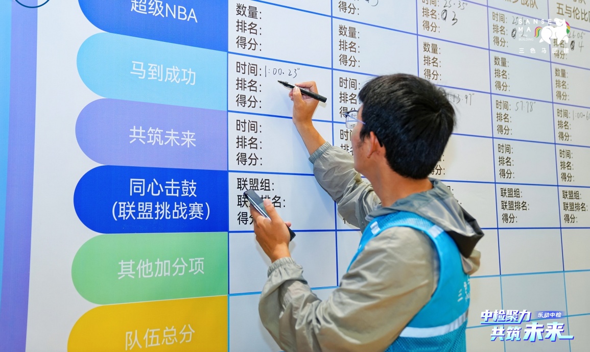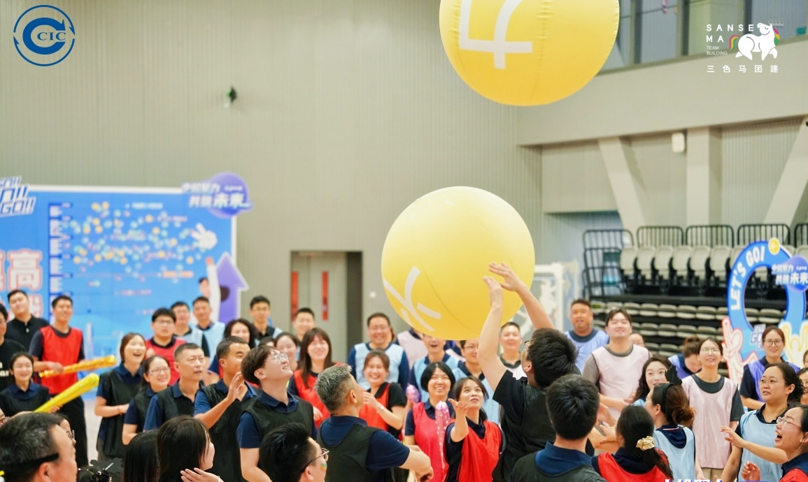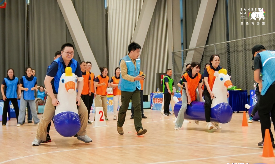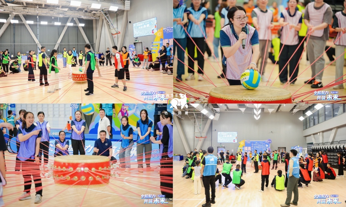 【趣味比赛环节】工作人员布置赛道、助教引导队伍轮换,依次开展招财进宝、超级NBA等项目比拼。最后进行同心击鼓挑战,10支队伍组成联盟队竞技,按名次为各队加分,现场氛围热烈。