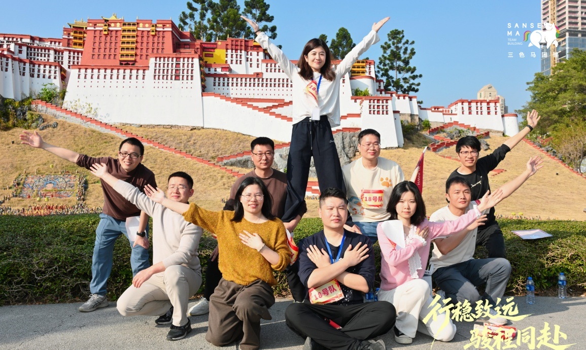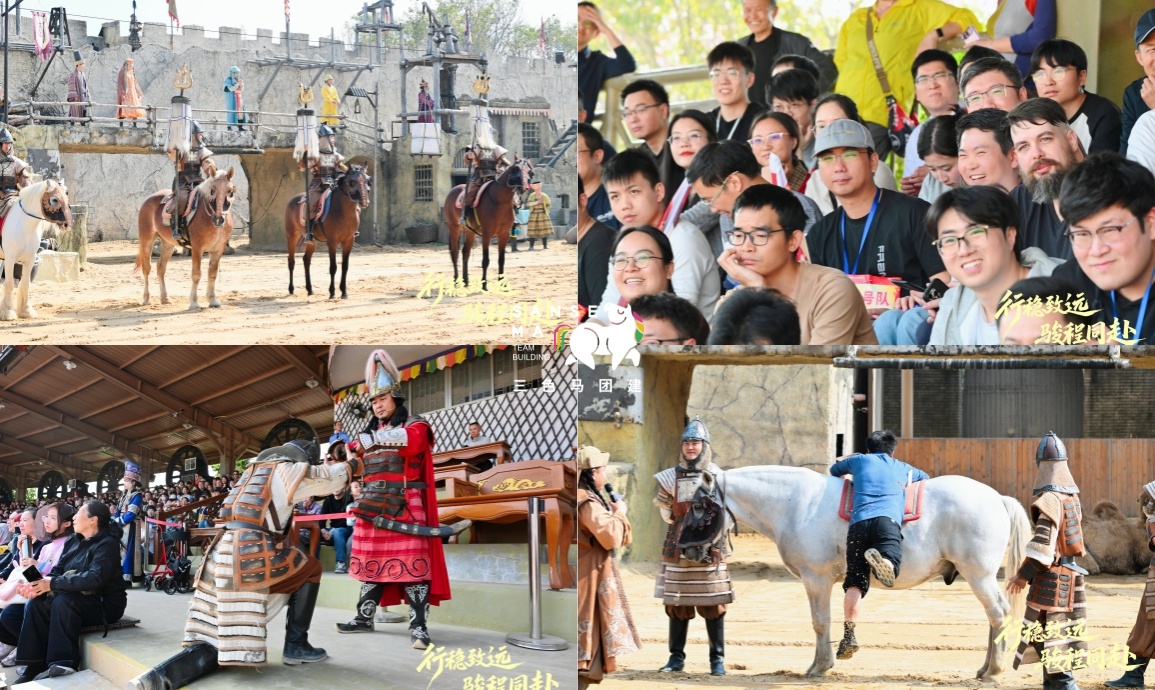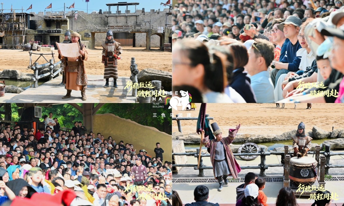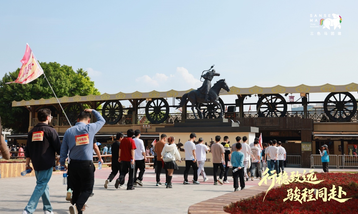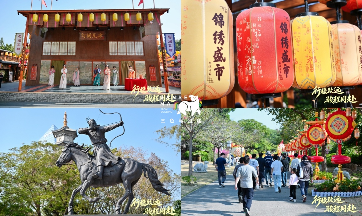 【团建创意主题活动】13:50-17:10,全员完成大合照、热身破冰、分队选队长,观看大漠传奇表演后,在队长带领下开展游园主题活动,完成游戏、打卡及共创任务,最终合影定格。