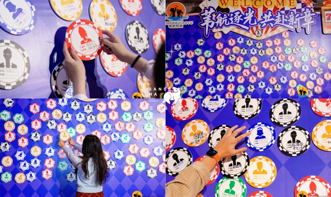 【筹码创意签到】伙伴们陆续到场,以独特的筹码签到开启年会之旅,队长领取专属物资(队伍手举牌、标识、游园卡、总筹码),仪式感拉满,满是对这场狂欢的期待~